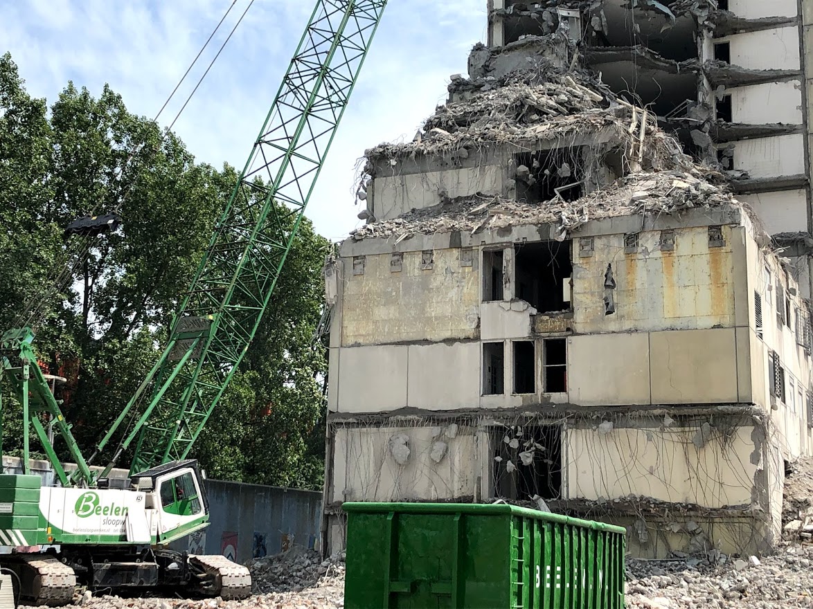 Vorige week slopers de eerste flat van de Bijlmerbajes zien ontmantelen. Je loopt het terrein zo op. De omvang van de operatie is indrukwekkend. Vijf van de zes flats worden gesloopt, één verandert er in een verticaal park. Inzet is ruim 95% van het bouwafval te hergebruiken. Soms herkenbaar, zoals brugleuningen van oude celdeuren en balkonhekjes van tralies, vaker als bouwmaterialen. Het nieuwe Bajeskwartier wordt een groene, energieneutrale autoluwe wijk met 1350 nieuwe woningen. De eerste bewoners worden in 2021 verwacht. Een mooie toevoeging aan dit diverse stuk stad.